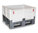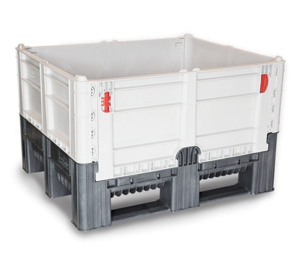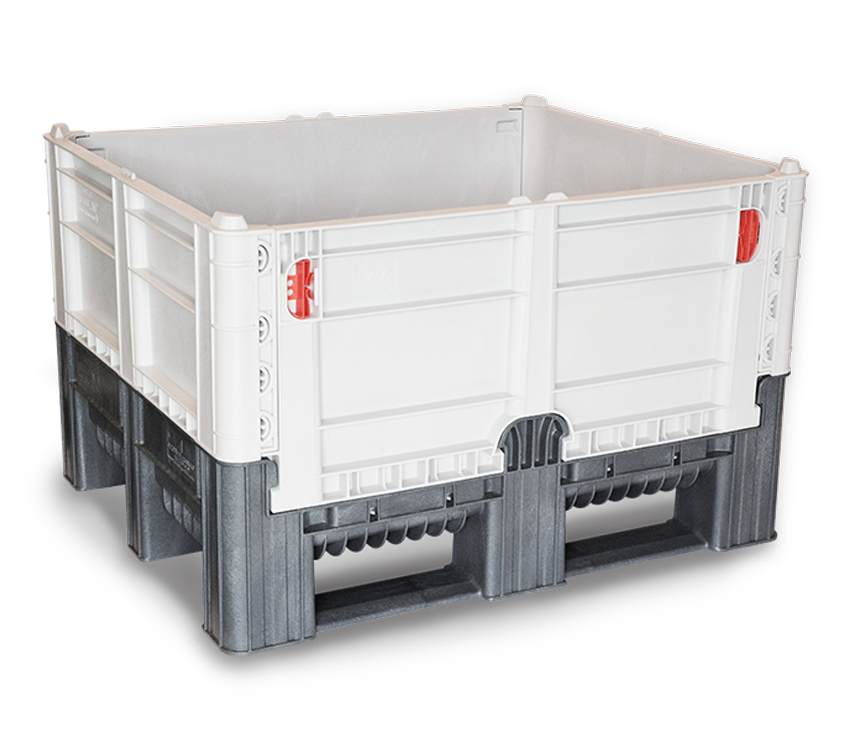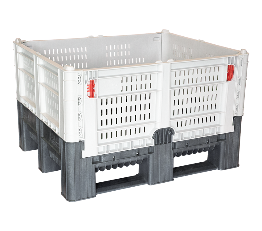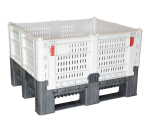 The DFC bin is a heavy-duty folding container with a hygienic, FDA approved design perfect for the clean and secure transport throughout the logistic supply chain. The walls of the DFC are foldable, and the breakdown and set up is easily managed by one person. Designed with three integral runners for stronger and more secured tipping when using a forklift, these bins are stackable, durable, and available in solid or vented walls.